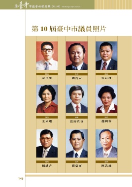 原 市議會回顧專輯 【第2輯】 ୋɚ 原臺中市議會 第 10 屆臺中市議員照片 ϵڀᄁ׳ක௴ࣛಂ ᙄࡰ ᙄࡰ ᙄࡰ ᙄࡰ ᙄࡰ ᙄࡰ 金萬里 劉茂安 張百村 賴天龍 何時雄 李玉花 ᙄࡰ ᙄࡰ ᙄࡰ 王素端 張廖貴專 趙國蓉 ᙄࡰ ᙄࡰ ᙄࡰ 賴誠吉 賴榮園 陳武雄 146 147