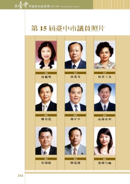 原 市議會回顧專輯 【第2輯】 ୋɚ 原臺中市議會 第 15 屆臺中市議員照片 ϵڀᄁ׳ක௴ࣛಂ ᙄࡰ ᙄࡰ ᙄࡰ ᙄࡰ ᙄࡰ ᙄࡰ 林佩樂 顏英男 林黃玉美 廖松柏 陳淑華 黃馨慧 ᙄࡰ ᙄࡰ ᙄࡰ ᙄࡰ ᙄࡰ ᙄࡰ 鄭功進 楊正中 張廖萬堅 陳三井 王秋冬 劉士州 ᙄࡰ ᙄࡰ ᙄࡰ ᙄࡰ ᙄࡰ ᙄࡰ 蔡錦隆 陳瑞德 張廖乃綸 何文海 丁振嘉 黃淑芬 216 217