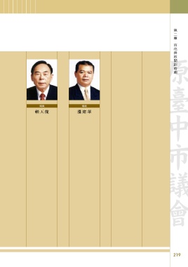 原 市議會回顧專輯 【第2輯】 ୋɚ 原臺中市議會 第 15 屆臺中市議員照片 ϵڀᄁ׳ක௴ࣛಂ ᙄࡰ ᙄࡰ ᙄࡰ ᙄࡰ ᙄࡰ 曾朝榮 陳清景 賴順仁 賴天龍 溫建華 ᙄࡰ ᙄࡰ ᙄࡰ 沈佑蓮 劉春財 陳武雄 ᙄࡰ ᙄࡰ ᙄࡰ 游民哲 蔡雅玲 林永能 218 219