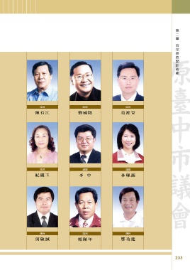 原 市議會回顧專輯 【第2輯】 ୋɚ 原臺中市議會 第 16 屆臺中市議員照片 ϵڀᄁ׳ක௴ࣛಂ ᙄڗ ਓᙄڗ ᙄࡰ ᙄࡰ ᙄࡰ ᙄࡰ 張宏年 陳天汶 黃國書 陳有江 劉國隆 范淞育 ᙄࡰ ᙄࡰ ᙄࡰ ᙄࡰ ᙄࡰ ᙄࡰ 洪嘉鴻 黃英傑 蕭 杰 紀麗玉 李 中 林珮涵 ᙄࡰ ᙄࡰ ᙄࡰ ᙄࡰ ᙄࡰ ᙄࡰ 莊乃慧 賴佳微 顏志修 何敏誠 賴頤年 鄭功進 232 233