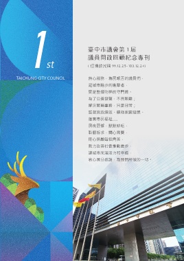 st 1 臺中市議會第 1 屆 議員問政回顧紀念專刊 TAICHUNG CITY COUNCIL ( 任期於民國 99.12.25-103.12.24) 熱心服務,為民喉舌的議員們, 是城市進步的進擊者, 更是監督防弊的守門員。 為了公義發聲,不畏艱難; 解決繁瑣事務,只是日常; 監督施政績效、積極家園發展、 落實市民福祉….. 夙夜匪懈,默默耕耘, 聆聽訴求,關心需要, 用心照顧每個角落, 戮力改善社會推動進步, 讓城市充滿活力和幸福, 衷心萬分感謝,為我們所做的一切。