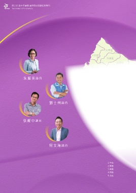 第 2 屆 臺中市議會 議員問政回顧紀念專刊 TAICHUNG CITY COUNCIL 大甲區 大安區 外埔區 后里區 清水區 石岡區 和平區 神岡區 豐原區 朱暖英 議員 梧棲區 東勢區 沙鹿區 大雅區 潭子區 龍井區 西屯區 北屯區 5 新社區 大肚區 南屯區 4 1 2 劉士州 議員 3 太平區 烏日區 大里區 霧峰區 張耀中 議員 何文海 議員 1 中區 2 東區 3 南區 4 西區 5 北區