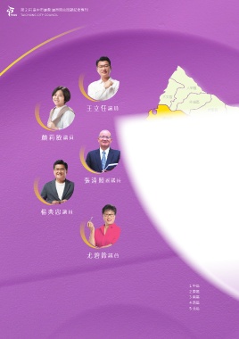 第 2 屆 臺中市議會 議員問政回顧紀念專刊 TAICHUNG CITY COUNCIL 大甲區 大安區 外埔區 王立任 議員 后里區 清水區 石岡區 和平區 神岡區 豐原區 東勢區 莉敏 議員 梧棲區 沙鹿區 大雅區 潭子區 龍井區 西屯區 北屯區 5 新社區 大肚區 南屯區 4 1 2 張清照 副議長 3 太平區 烏日區 大里區 霧峰區 楊典忠 議員 尤碧 鈴 議員 1 中區 2 東區 3 南區 4 西區 5 北區