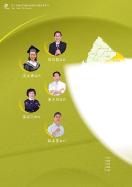第 2 屆 臺中市議會 議員問政回顧紀念專刊 TAICHUNG CITY COUNCIL 大甲區 大安區 外埔區 陳清龍 議員 后里區 清水區 石岡區 和平區 神岡區 豐原區 翁美春 議員 梧棲區 東勢區 沙鹿區 大雅區 潭子區 龍井區 西屯區 北屯區 5 新社區 大肚區 南屯區 4 1 2 謝志忠 議員 3 太平區 烏日區 大里區 霧峰區 張 分 議員 陳本添 議員 1 中區 2 東區 3 南區 4 西區 5 北區