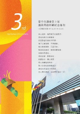 rd 3 臺中市議會第 3 屆 議員問政回顧紀念專刊 TAICHUNG CITY COUNCIL ( 任期於民國 107.12.25-111.12.24) 熱心服務,為民喉舌的議員們, 是城市進步的進擊者, 更是監督防弊的守門員。 為了公義發聲,不畏艱難; 解決繁瑣事務,只是日常; 監督施政績效、積極家園發展、 落實市民福祉….. 夙夜匪懈,默默耕耘, 聆聽訴求,關心需要, 用心照顧每個角落, 戮力改善社會推動進步, 讓城市充滿活力和幸福, 衷心萬分感謝,為我們所做的一切。